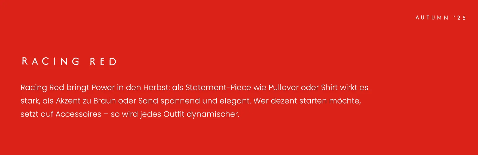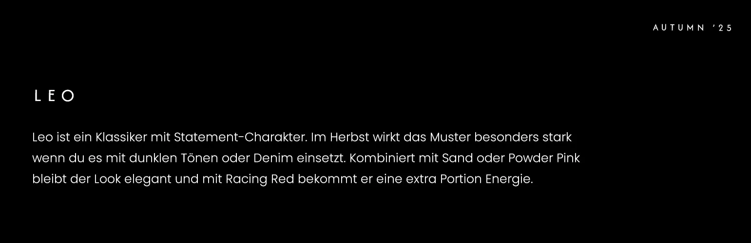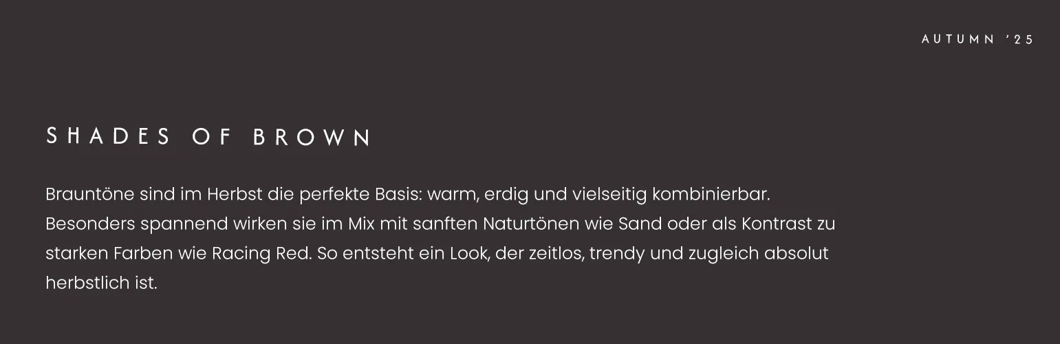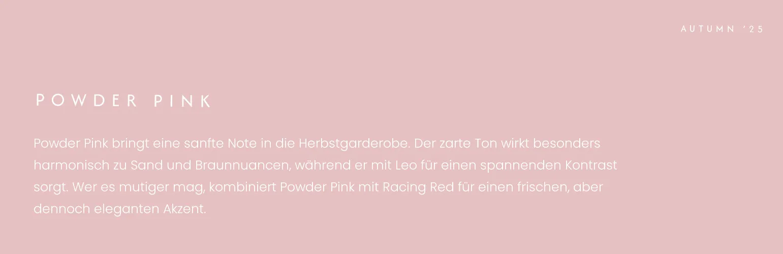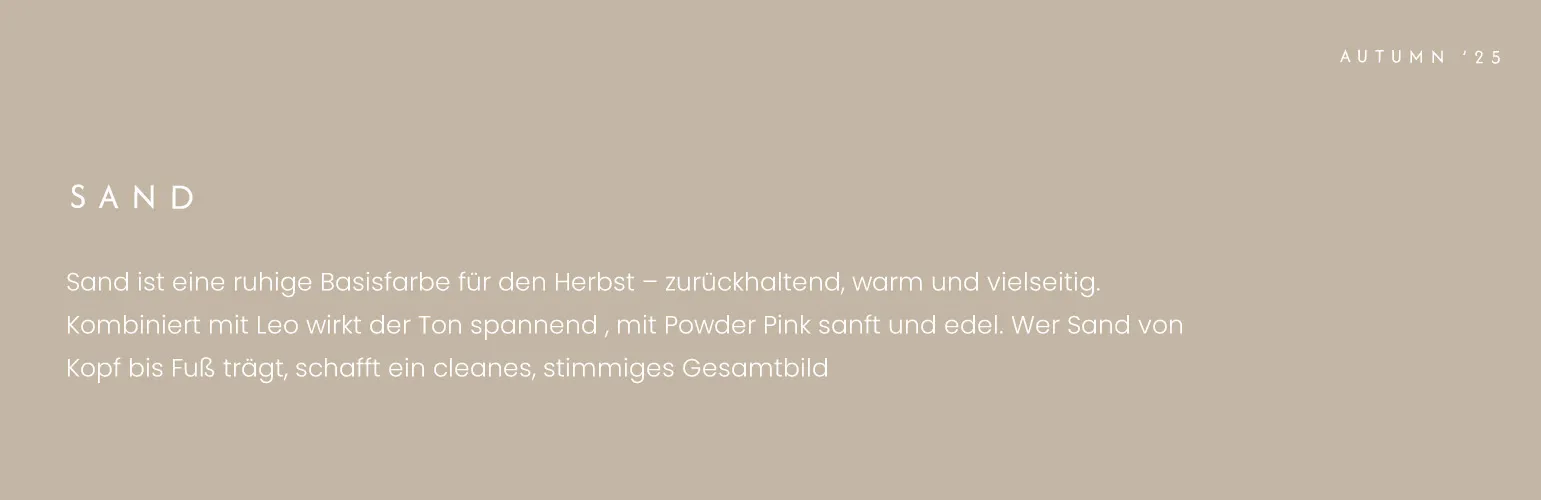 Die neue Saison zeigt sich in einer spannenden Farbpalette, die Wärme, Eleganz und selbstbewusste Statements vereint. Shades of Brown schaffen eine stilvolle Basisund bringen cozy Vibes in jedes Outfit. Dazu setzen Racing Red und Leo starke Akzente – perfekt, um deinem Outfit das gewisse Extra zu verleihen.Zarte Nuancen wie Sand und Powder Pink verleihen dem Look hingegen Leichtigkeit und Weiblichkeit. Zusammen ergeben diese Farben eine inspirierende Mischung, die sich vielseitig kombinieren lässt und deinen Style neu definiert.